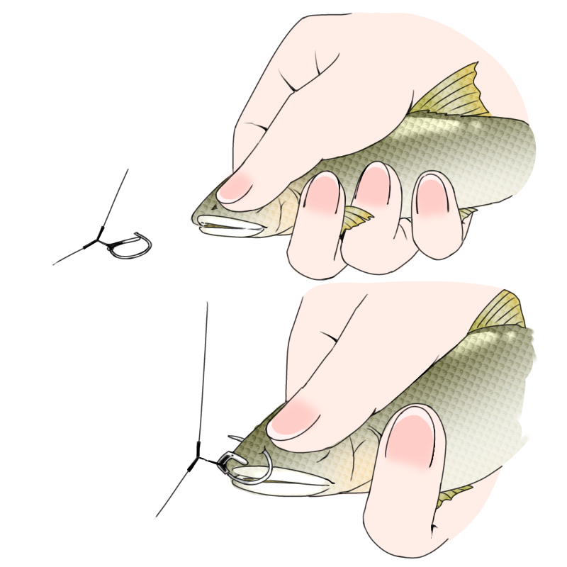 Once you’ve attached the nose ring to the fish’s nose and inserted the reverse hook near the tail fin, you can let the bait swim in the river.